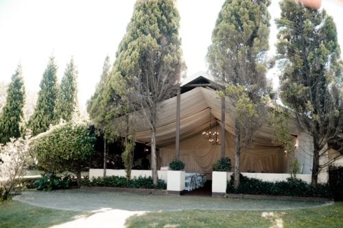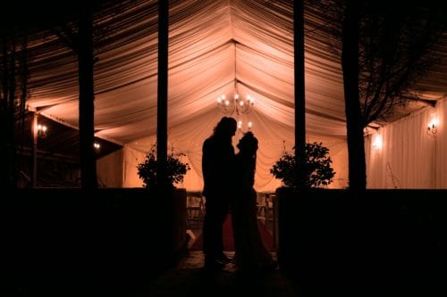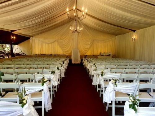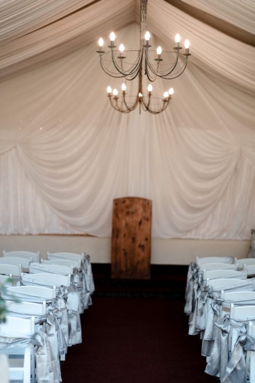 Our serene country wedding chapel provides a magical experience thanks to its lavish back-lit draping, rustic chandeliers and a touch of the outside gardens forming one of the sidewalls. The chapel is covered by a full roof installation.